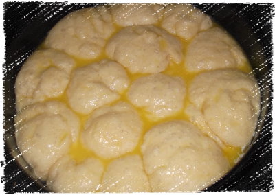 Den Backofen auf 180° (Umluft 160°) vorheizen. Die Butter zerlassen und über die Teigkugeln gießen.