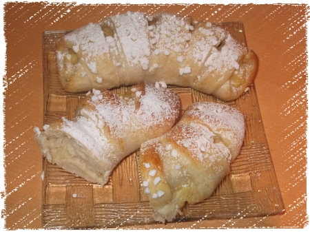 Jedes Stück länglich ausrollen und einschneiden, mit Pudding füllen, von der Puddingseite her aufrollen und auf ein mit Backpapier ausgelegtes